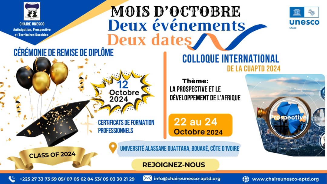 Le 12 octobre 2024 sera une date importante pour l’Université Alassane Ouattara (UAO) de Bouaké, où la Chaire UNESCO « Anticipation, Prospective et Territoires Durables » (CUAPTD) organisera la cérémonie de remise des certificats pour sa deuxième promotion d’auditeurs ayant suivi des formations certifiantes. Cet événement se tiendra à l’Amphi C du Campus 2 à partir de 14 heures.